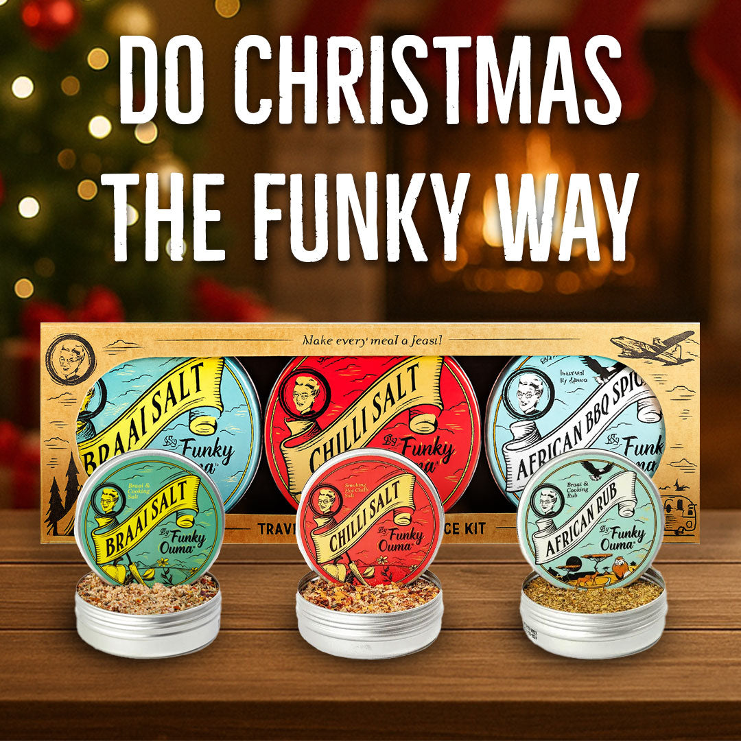 Transform your meals with our Funky Ouma Classic Travel Tin set featuring three carefully crafted seasoning salts that will elevate every dish.